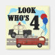 Un croiseur de police, un moteur de pompiers, des ballons et un texte qui dit "Regardez qui est 4" est présenté sur notre design quotidien Héros 4th Birthday.