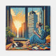 Jolie femme de style pop art de la bande dessinée, assise dans une fenêtre de la ville, tenant une tasse de café donnant sur les gratte-ciel de la ville tandis que le soleil se lève tandis que son chat fait la sieste à côté d'elle.