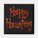 Texte "Happy Haunting" en lettres spectrales orange, avec quelques yeux fantomatiques, un dessin humoristique pour une Halloween obsédante.