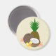 Un aimant avec une illustration tropicale d'un ananas derrière une noix de coco et demi entourée de trois fleurs d'hibiscus.