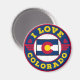 I Love Colorado State Map and Flag. S'inspirant du drapeau de l'État, ce design présente un code couleur bleu, rouge et jaune, ainsi que des coeurs rouges. Ceci encadre le drapeau d'état, à l'intérieur d'une silhouette de la carte d'état. Avec la typographie en détresse cool avec l'expression 'I LOVE COLORADO'.