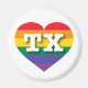 Cet aimant présente un coeur de fierté arc-en-ciel contenant les lettres majuscules grasses et blanches TX, l'abréviation officielle pour le Texas, l'état étoilé solitaire. Montrez vos vraies couleurs, soutenez l'égalité dans le mariage et célébrez le gay pride.