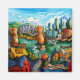 Cette scène classique de Vancouver est ce que vous voyez quand vous traversez le pont de Granville Street. Il comprend un décor montagnard, un peu de Stanley Park, le terminal de ferry de Granville Island et le joli pont Art déco de Burrard Street entouré de bateaux et de bâtiments. Je voulais souligner le contraste des immeubles de bureaux du centre-ville uniformément conçus et réfléchis par rapport à la communauté néo-brillante de l'ex-industrie de Granville Island. Les bâtiments du centre-ville semblent toujours grands et sauvages mais tous très semblables, comme un champ de fleurs tournant vers le soleil tandis que Granville Island est tout fou-irrégulier et lumineux.