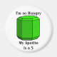 Le texte sur cet aimant de réfrigérateur dit "J'ai tellement faim, mon apatite est un 5," et présente un modèle de dessin animé vert de la structure cristalline de l'apatite minérale. Pour ceux qui n'ont pas l'allure minéralogique, le jeu de mots est que "l'appatite" sonne comme "l'appétit", et que l'appatite minérale se classe 5 sur l'échelle de dureté Mohs. Forme de cristal dessinée à partir de croquis de Perkins et Henke, 2004.