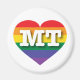 Cet aimant présente un coeur avec un motif de fierté arc-en-ciel et les caractères gras, blancs, majuscules MT, l'abréviation officielle pour Montana, l'état trésor. Montrez vos vraies couleurs, soutenez l'égalité dans le mariage et célébrez le gay pride.