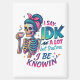 Design coloré et dynamique, avec un squelette féminin sirotant du café. Le texte coloré dit : "Je dis beaucoup IDK mais croyez-moi, je suis au courant". Ce design est disponible sur une grande variété de produits.