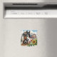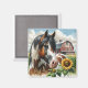 Joli aimant avec un cheval tacheté marron, noir et blanc entouré de tournesols et une grange rouge rustique dans l'arrière - plan. Mignonne pour une ferme ou un thème rustique ou pour toute personne qui aime les chevaux.