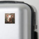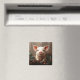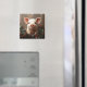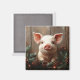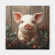 Magnet avec une peinture à l'huile numérique d'un cochon mignon entouré de cônes de pins et de guirlande de pins aux lumières de Noël. L'arrière - plan en bois ajoute une touche rustique à l'oeuvre.