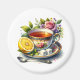 Joli art de l'air représentant une jolie tasse de thé antique remplie d'un haie de citron et de cubes à sucre et de roses sur le côté.