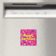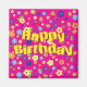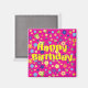 Aimant carré avec l'image de "Joyeux Anniversaire" en grandes lettres jaunes sur un arrière - plan de fleurs fantaisistes sur rose. Voir l'ensemble de la collection d'aimants d'anniversaire dans les TOUCHES SPÉCIALES | Section Favoris.