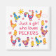 Dessin joli et coloré de poulets avec une remarque humoristique disant :Juste une fille qui aime les pics