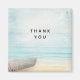 aimant Merci avec une belle image rustique. Couleurs subtiles de bleu clair, marron sablonneux et blanc doux. Une scène de plage avec un bateau sur le rivage avec un filet de pêche accroché à côté. Un élégant look défraîchi.