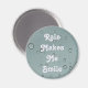 La pluie me fait sourire est le sentiment sur cet aimant rond. L'arrière - plan présente une photo d'un motif de gouttelettes d'eau circulaires après une tempête de pluie. Les gouttes de pluie ont été photographiées à travers le verre contre le ciel gris foncé. Tout le texte peut être customisé si vous le désirez.