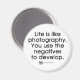 Ce design graphique élégant et amusant avec l'expression "La vie est comme la photographie. Vous utilisez les négatifs pour développer" est parfait pour le photographe à la recherche de quelque chose unique pour leur garde-robe.