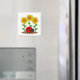 Cette conception est d'un coccinelle rouge souriant debout devant un groupe de tournesols jaunes et oranges.