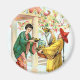 vintage aquarelle de la "lampe d'aladdin" de conte de fées avec un porcelaine portant un casquette rouge, de longs poils fins, de la moustache, un manteau jaune et un pantalon orange, tenant un panier rempli de lampes et tenant une lampe pour l'échanger avec une autre vieille lampe tenue et offerte par une dame au style de cheveux japonais ancien, manteau vert et robe rose décorée, sortant d'un palais avec des colonnes et blanc toit rouge, dans un joli jardin avec un joli arbre aux fleurs roses et rouges. Art vintage dans les roses et jaunes.