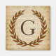 Une délicate couronne de laurier est posée sur un arrière - plan vintage de partitions de style romain classique. Ce design est personnalisé avec le monogramme "G" dans une tonalité de sienne riche.
