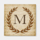 Une délicate couronne de laurier est posée sur un arrière - plan vintage de partitions de style romain classique. Ce design est personnalisé avec le monogramme "M" dans une tonalité de sienne riche.