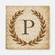 Une délicate couronne de laurier est posée sur un arrière - plan vintage de partitions de style romain classique. Ce design est personnalisé avec le monogramme "P" dans une tonalité de sienne riche.