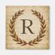 Une délicate couronne de laurier est posée sur un arrière - plan vintage de partitions de style romain classique. Ce design est personnalisé avec le monogramme "R" dans une tonalité de sienne riche.