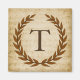 Une délicate couronne de laurier est posée sur un arrière - plan vintage de partitions de style romain classique. Ce design est personnalisé avec le monogramme "T" dans une tonalité de sienne riche.
