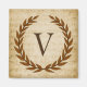 Une délicate couronne de laurier est posée sur un arrière - plan vintage de partitions de style romain classique. Ce design est personnalisé avec le monogramme "V" dans une tonalité de sienne riche.
