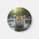 Le tigre d'eau : un prédateur majestueux Un gros plan captivant capte l'intensité d'un tigre partiellement immergé dans l'eau. Des gouttelettes cristallines s'accrochent à ses magnifiques rayures orange et noire, scintillantes comme des bijoux épars. Le regard du tigre est à la fois puissant et attentif, ses yeux ambrés fixés avec une attention constante. Des indices de mouvement se répandent dans l'arrière - plan flou, faisant allusion à l'environnement aquatique que ce prédateur apex navigue sans effort.