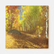 Un sentier surélevé qui serpente à travers la forêt de bouleaux par une journée d'automne ensoleillée. Les troncs noirs et blancs des arbres contrastent avec les feuilles et l'herbe dans toutes les nuances d'or, du jaune pâle à l'orange profond, éclairés par les rayons du soleil qui traversent les branches.