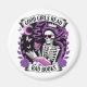 Un design coloré et dynamique présente un squelette féminin lisant un livre tout en sirotant un cocktail torride. Elle est entourée de fleurs violettes et de papillons, ajoutant à l'esthétique animée. Le texte gras et coloré dit : "Les bonnes filles lisent de mauvais livres." Ce design unique est disponible sur une large gamme de produits.