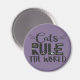 Amusant et adorable aimant frigo violet moderne avec les mots "Les chats dominent le monde", décoré de whiskies blancs, rayures de chat, une petite souris, et une petite patte.