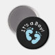 Des empreintes de bébé bleues sur un arrière - plan noir et un texte blanc qui dit "C'est un garçon !" sur les boutons de faire-part de bébé garçon.