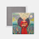 Une dame en rouge tient un renard dans un cadre surréaliste avec des lucioles