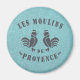 Aimant rond avec une image de burlap bleu avec des coqs gris et le texte "Les Moulins De Provence" en gris. Voir la collection d'aimants Cancan dans TOUCHES SPÉCIALES | Section Favoris.