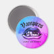 Aimant Vampire avec le texte amusant Vampires Don't Do Plats et une oeuvre d'art originale dans le style vaporware. Il présente une bouche de vampire avec des crocs et des dents cassées, des créatures maléfiques qui se cachent dans le noir dans des couleurs psychédéliques bleu, violet et rose. Design pour Halloween et pour les amateurs de style gothique pastel avec un sens de l'humour.