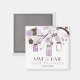 Des illustrations mignonnes et fantaisistes de jarres de mason lilas et brun, d'oiseaux de l'amour, de fleurs et de cordes de coeur, toutes perchées sur des branches d'arbres. Ce jeu amusant et romantique sauvez l'aimant de date est parfait pour un mariage d'été ou de printemps.