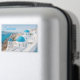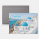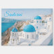 Cette aquarelle représente le village pittoresque de Santorin, en Grèce, avec ses célèbres églises à dômes bleus et son architecture blanchie à la chaux, face à la mer Egée.