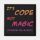 C'est Code Not Magic (Quelqu'un dit à mon patron) - un petit humour cynique enveloppé dans un aimant pour votre tableau blanc préféré. Texte orange, rouge et violet sur un arrière - plan noir.