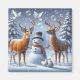 Un bonhomme de neige au nez de carotte dans un casquette noir dépoli sourit entre deux cerfs-volants. Un cerf souffle joyeusement des bulles transparentes colorées dans le ciel enneigé, tandis que des tourterelles blanches volantes regardent sur un fond gris nuageux.