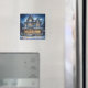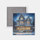 Maison d'hiver saisonnière illuminée sur un aimant de Noël enneigé.