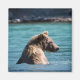 This striking image captures a majestic Alaskan Brown Bear (Grizzly) partially submerged in the frigid, turquoise waters of an Alaskan river. The bear is seen in profile, its thick, shaggy fur—drenched from the glacial runoff—clumping into dark, wet peaks along its powerful neck and shoulders. A patch of lighter, sun-bleached golden fur stands out near its nape, highlighting the rugged texture of its coat.