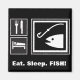 Graphiques de style panneau noir, blanc et gris représentant les nécessités de la vie. Petites icônes pour manger et dormir utilisant le couteau et la fourchette standard de service de nourriture, et les photos de toit et de lit de l'hébergement motel. Graphique de PÊCHE extra grand montrant une tête de poisson et un hameçon de pêche, parce que bien sûr la pêche importe plus que manger et dormir!
