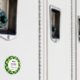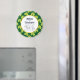 Un aimant mariage avec un motif extensible mignon avec des trèfles vert olive sur un arrière - plan vert foncé. Un cercle blanc avec une fausse bordure en feuille d'or superposée avec votre texte à l'intérieur.