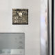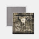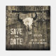 Crâne de vache mariage rustique de l'ouest avec cornes style vintage enregistrer la date annonce carré frigo aimant. Ranch grunge texture. Le cow-boy en bois de grange s'est inspiré. Art antique sepia brun bison. Image copyright Marg Seregelyi Photographie.
