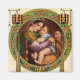 peinture de style renaissance de madonna et enfant avec madonna portant sur ses épaules une écharpe verte et orange, un foulard blanc et rouge, et une robe mauve, tenant le christ enfant habillé en bleu et joseph les regarde à l'intérieur d'un cadre rond décoré de saints feuilles et de saintes baies. belle photo de noël avec cadre décoré de christmassy avec lanternes. art chrétien vintage vert et brun ..