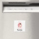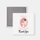 Magnet de remerciement pour la fête de mariage. Conçu avec une illustration d'une mariée souriante tenant un bouquet de fleurs dans sa robe de mariée blanche fantaisie et portant un voile. Placé dans un cadre ovale rose avec une bordure festonnée.