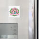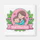 Magnifique aimant idéal pour la fête des mères. Une illustration adorable d'une mère et de son enfant se donnant un câlin affectueux. Tous deux portent une chemise bleue et ont les cheveux bruns. Tous deux ont un sourire aimant et des joues roses. Ils sont représentés à l'intérieur d'un cercle rose avec des étincelles et deux cœurs d'amour parsèment les alentours. En dessous d'eux se trouve une bannière rose avec un texte élégant qui dit "Meilleure maman du monde", c'est un modèle qui peut être utilisé tel quel ou remplacer le texte original par le vôtre pour personnaliser. Autour du cercle et de la bannière se trouvent des feuilles vertes et des fleurs roses. Un joli dessin idéal pour votre maman.