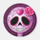 Cet adorable crâne à sucre violet est décoré de tourbillons tribaux et de gouttes avec un grand coeur au milieu du front. Une seule rose rose est assise sur le côté du crâne rond juste au-dessus des grands yeux noirs. Des pédales de fleurs violettes entourent les yeux et la bouche a des points qui font leur chemin vers le haut du côté de la joue. Le crâne est assis sur un arrière - plan violet profond créant un beau contraste. Ce design d'aimant est un bel exemple de ce Jour des Morts.