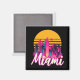 Style rétro "Miami" illustration de design de texte au coucher du soleil avec le soleil et gratte-ciel décoration en rose, jaune et violet
