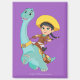 Ce design enchanteur capture un moment de joie de Dino Ranch, avec la cowgirl joyeuse Min chevauchant son brontosaurus bien-aimé, Clover. Min porte son casquette de cowboy jaune caractéristique, une chemise à damiers brune et jaune, un gilet marron, un pantalon blanc et des bottes noires. Elle sourit chaleureusement, tenant les rênes de la selle jaune de Clover ornée d'une étoile. Clover, l'amical brontosaurus bleu clair, a un grand sourire et semble profiter de la promenade. L'arrière - plan est un blanc propre, ce qui rend les personnages et leurs couleurs vibrantes pop. Cette oeuvre incarne parfaitement l'amusement et l'amitié qui sont au coeur de Dino Ranch, un spectacle dont beaucoup profitent sur des plateformes comme CBC Radio Canada.