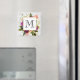 A magnet with a pretty watercolor design. A floral arrangement of many different varieties of flowers in red, pink and white colors, and lots of leafy green foliage. A frame layered over top with a faux-gold-foil border. Classy and elegant design. An off-white marble pattern background. Personalize with a monogram letter.